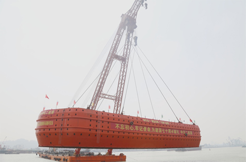 東江南支流港灣大橋主墩承臺防撞套箱,采用固定式釋能附體型結構。鋼套箱長73.12米、寬23.8米、高9.5米,重量約1100噸,正常使用壽命為30年。本次下放的鋼套箱為主橋25#墩。大橋所在的東莞水道為5000噸級海輪航道,橋位區域河流航道繁忙,船舶流量約每天400艘次,鋼套箱下放施工難度大,通航安全風險極高。