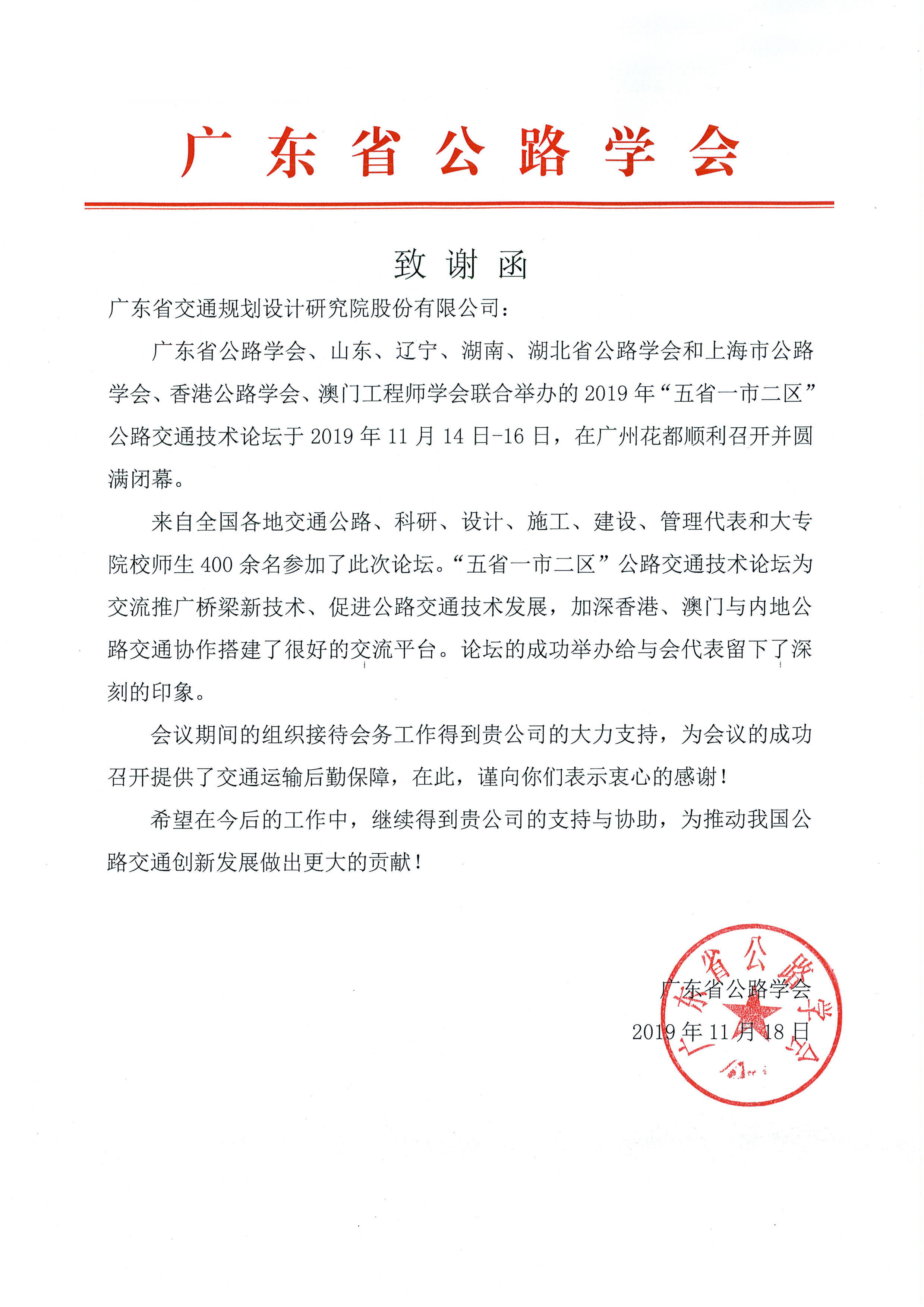 我公司高度重視此次論壇的協辦工作,派出會務團隊全程跟進、積極配合、傾力服務,為會議的成功召開貢獻了一份力量,得到了主辦方廣東省公路學會的高度肯定。為此,省公路學會特發來致謝函向我公司表示感謝!