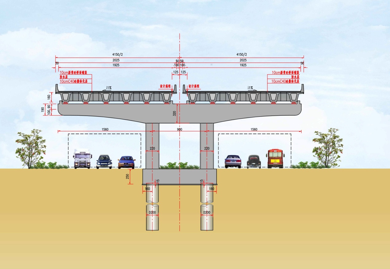 本項目中,橋梁與民古路共線長度達27.25km。民古路利用高速公路橋下空間布設(shè),因而在設(shè)計時注重對橋梁的上、下部結(jié)構(gòu)的選用以及橋梁景觀等內(nèi)容的比選。推薦方案橋梁墩柱利用橋下道路中央分隔帶集中落墩,采用了整幅大懸臂雙柱墩,并以倒“T”截面降低蓋梁視覺高度,減少占用橋下空間。