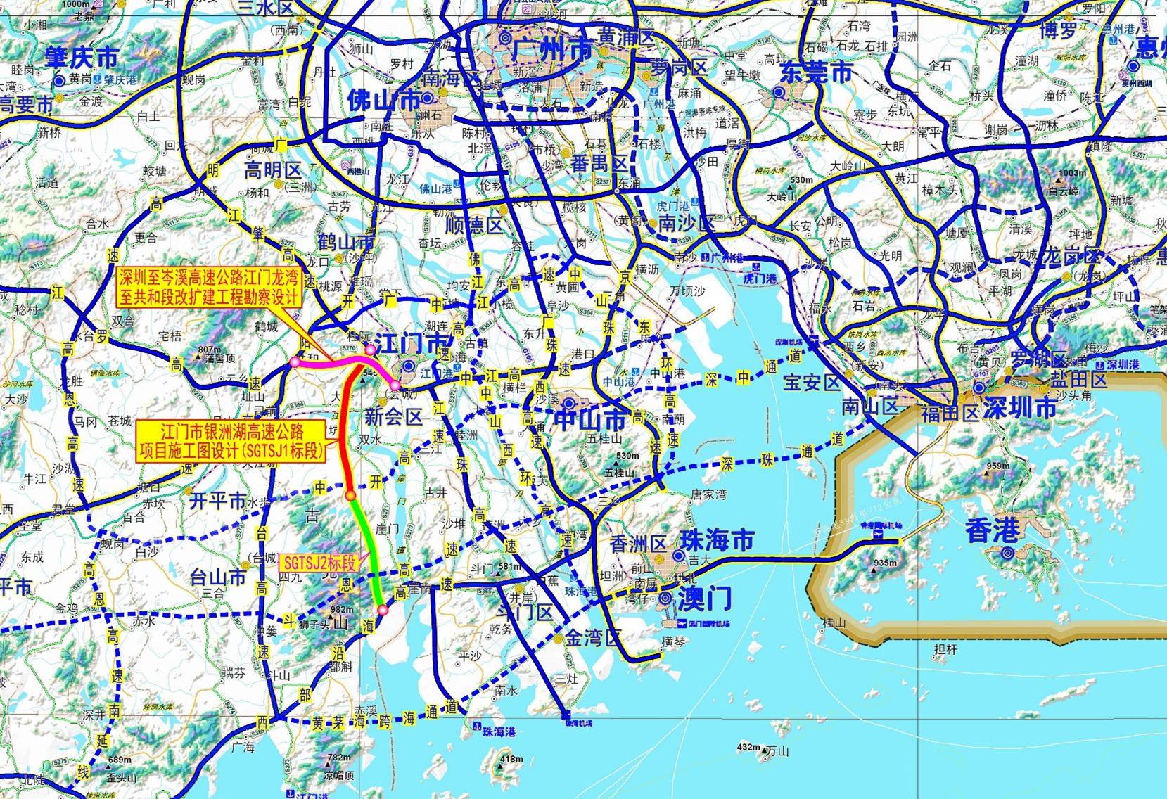 江門市銀洲湖高速公路項目路線起于蓬江區棠下鎮,接珠三角環線高速公路,終點位于新會區崖門鎮(接西部沿海高速公路),長約53.8km,采用雙向六車道高速公路標準,設計速度120km/h,路基寬度34.5m。我司承擔的是銀洲湖高速SGTSJ1標段(總體標)的土建勘察設計和總體協調任務。該標段全長約31.3km,總投資約82億元。