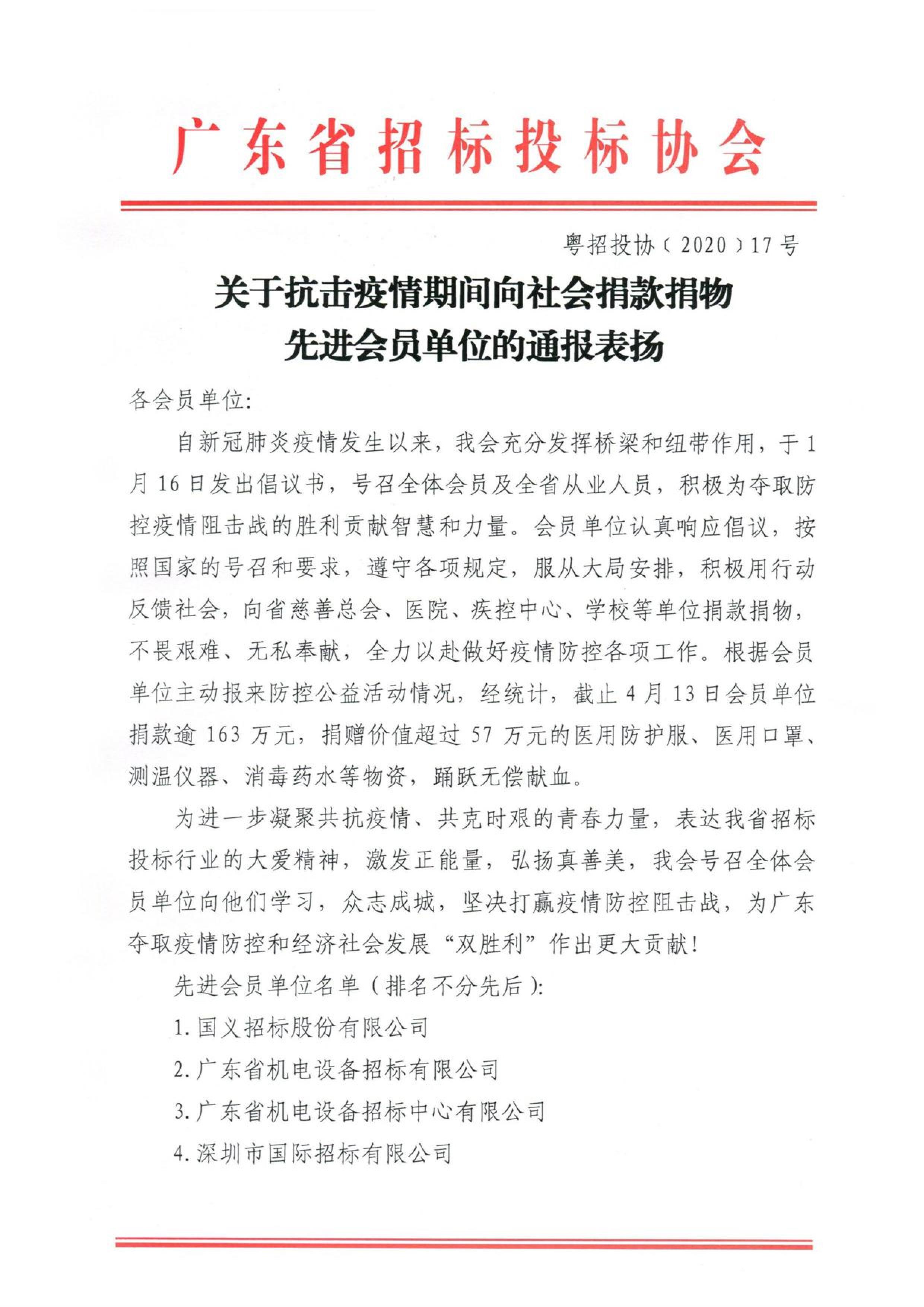 近日,我公司及員工在抗擊疫情期間踴躍捐款、獻血奉獻愛心,積極用行動為抗疫貢獻力量,公司獲得了廣東省招標投標協會的通報表揚。
