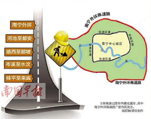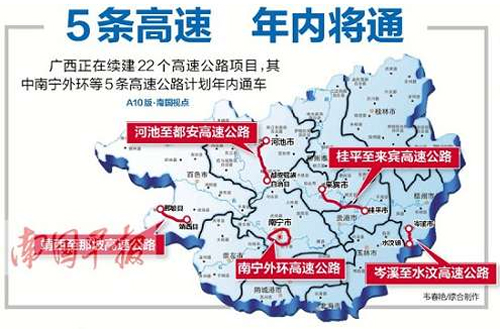 今年自治區(qū)續(xù)建的高速公路項目共有22個,建設高速公路里程2270公里。計劃年內建成通車的南寧外環(huán)、河池至都安、靖西至那坡、岑溪至水汶、桂平至來賓5條高速公路,目前正緊張有序地開展路面基層、面層、交安、房建、綠化等各項施工,進展順利,計劃新增高速公路里程約389公里。其他17個續(xù)建項目中,完成計劃總投資在70%以上的項目有6個,其中百色至靖西、陽朔至鹿寨、灌陽至鳳凰完成計劃總投資超過80%。此外,計劃年內開工吳圩機場至大塘、河池至百色、沿海高速公路改建工程南間至欽州段、柳州至南寧高速公路改擴建工程4個項目,開工里程超過600公里;力爭開工荔浦至玉林、樂業(yè)至百色、松旺至鐵山港等高速公路項目。
